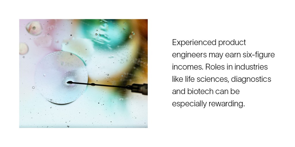 [Experienced product engineers may earn six-figure incomes. Roles in industries like life sciences, diagnostics and biotech can be especially rewarding.]